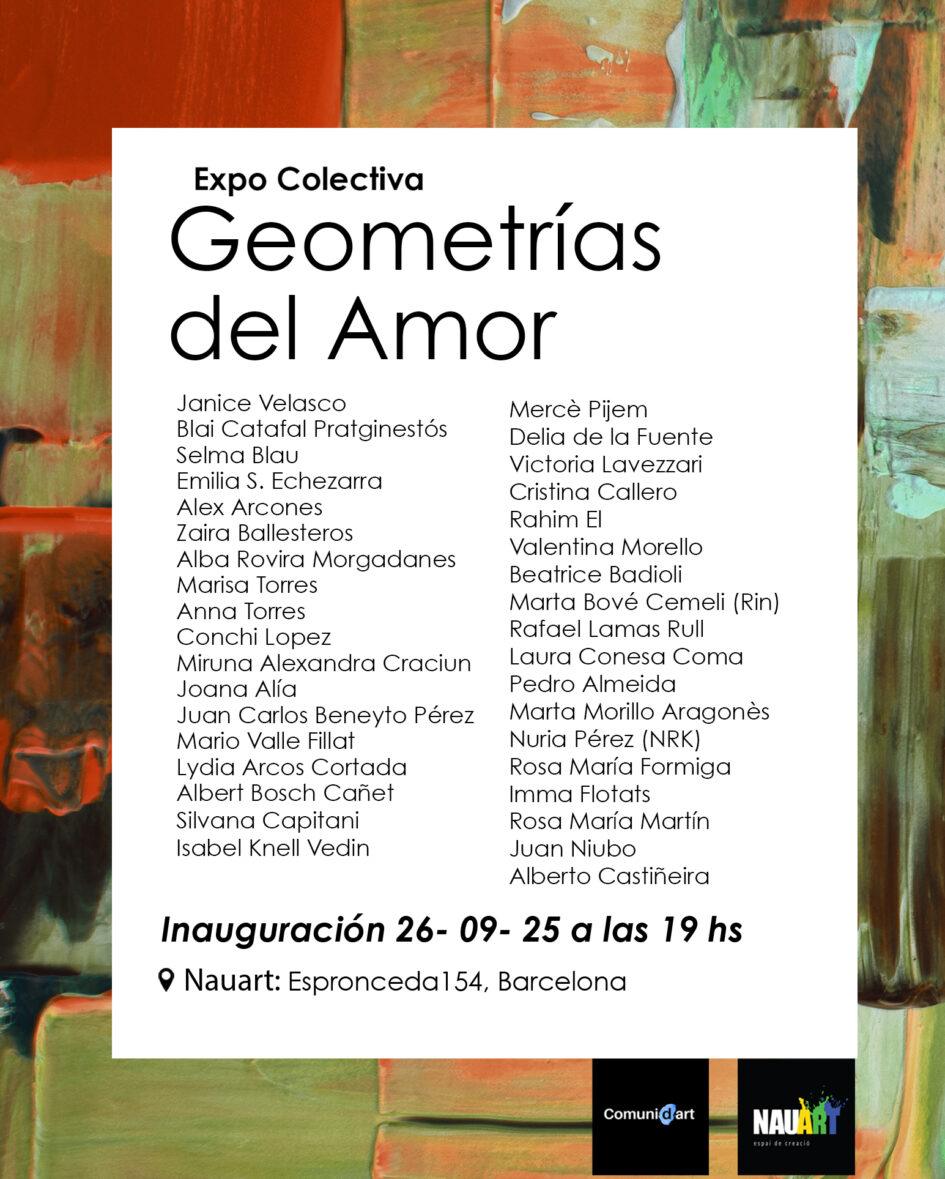 Nos complace invitarlos a la inauguración de la exposición colectiva “Geometrías del Amor”. Este viernes 26 de septiembre a las 19 hs en espiar Nauart: calle Espronceda 154, Barcelona.